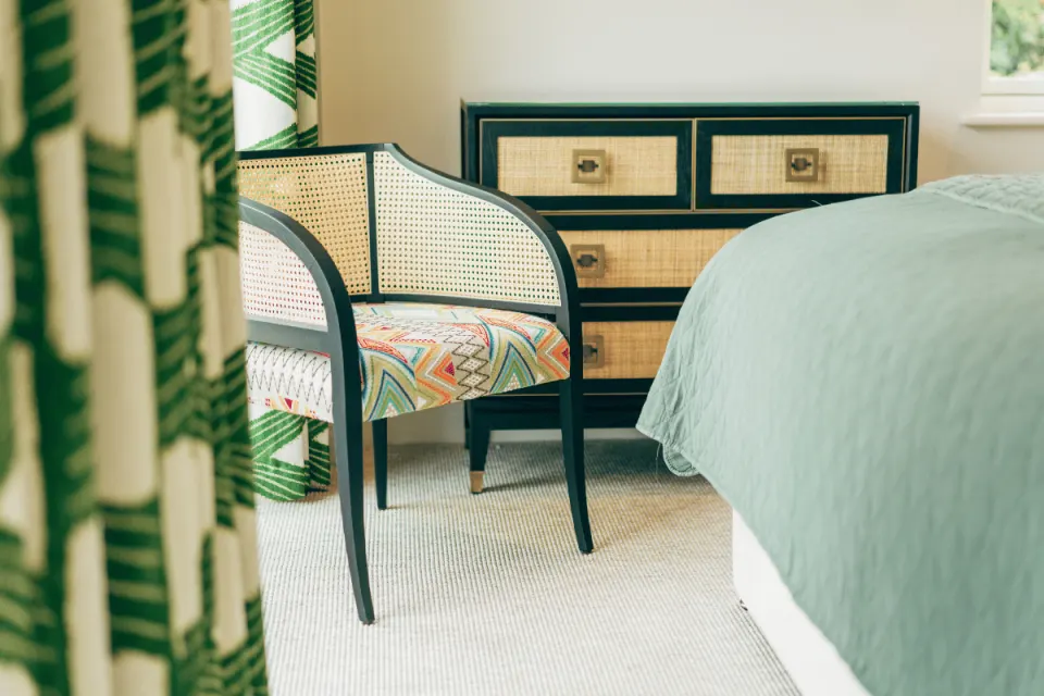 In the primary suite, juniper greens and soft embroideries create a cocoon-like atmosphere, while the dramatic turquoise tiles in the ensuite bathroom evoke rock pools and coastal waters. Each bedroom tells its own colour story while contributing to the overall narrative of the place.