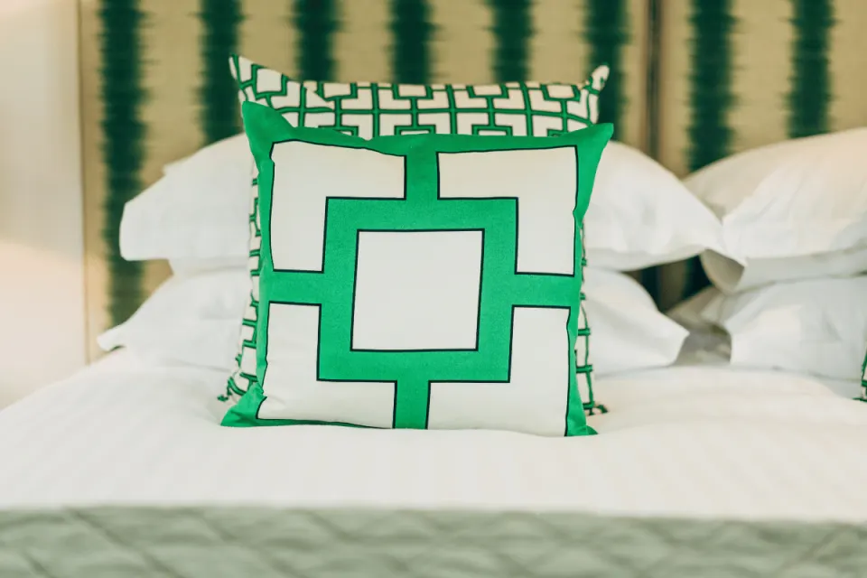 The mix of textures – from forest green velvet sofas to Kit Kemp collection footstools, Christopher Farr upholstered armchairs, and sustainable oak herringbone flooring – creates spaces that feel both luxurious and lived-in.